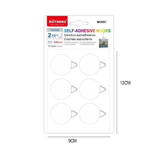 View full detailsOrganize your space with the Motarro Self-Adhesive Hooks. This pack contains 12 round hooks, each with a diameter of 30mm, and 12 labels. The self-...